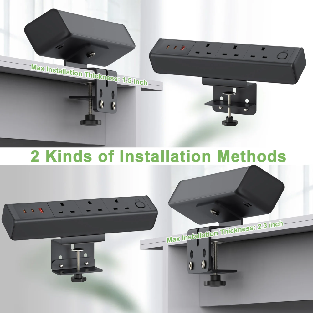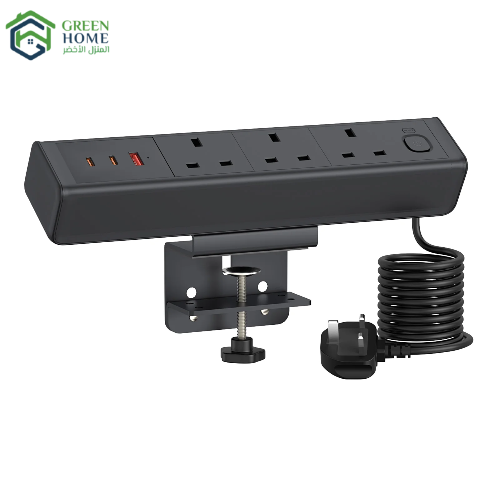اكتشف توصيلة كهرباء مكتبية عالية الجودة بقدرة 65 واط بتصميم أنيق باللون الأسود. تحتوي على 3 منافذ UK، ومنفذ USB-A، ومنفذين Type-C للشحن السريع. مثالية للمكاتب والمنازل. تثبيت آمن بفضل مشبك معدني قوي. متوفرة الآن لدى جرين هوم.