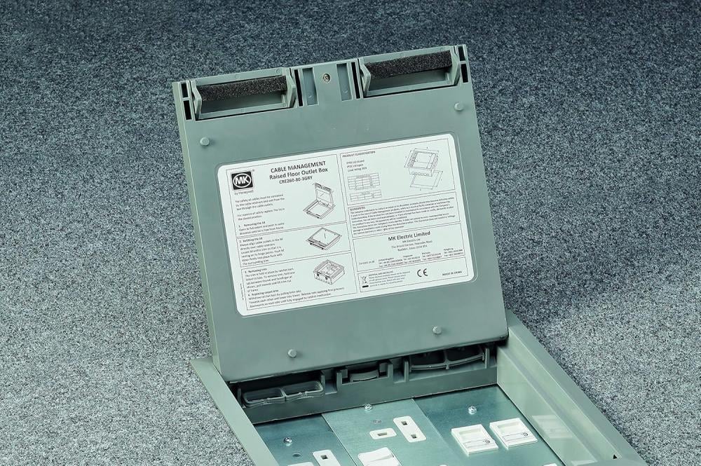 This MK floor box is a complete solution for concealed floor-level power and data distribution. It is designed to fit concrete or raised floors in commercial and residential buildings. The box is widely used in Saudi Arabia for office fit-outs, towers, conference rooms, and hotels.
