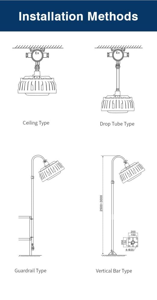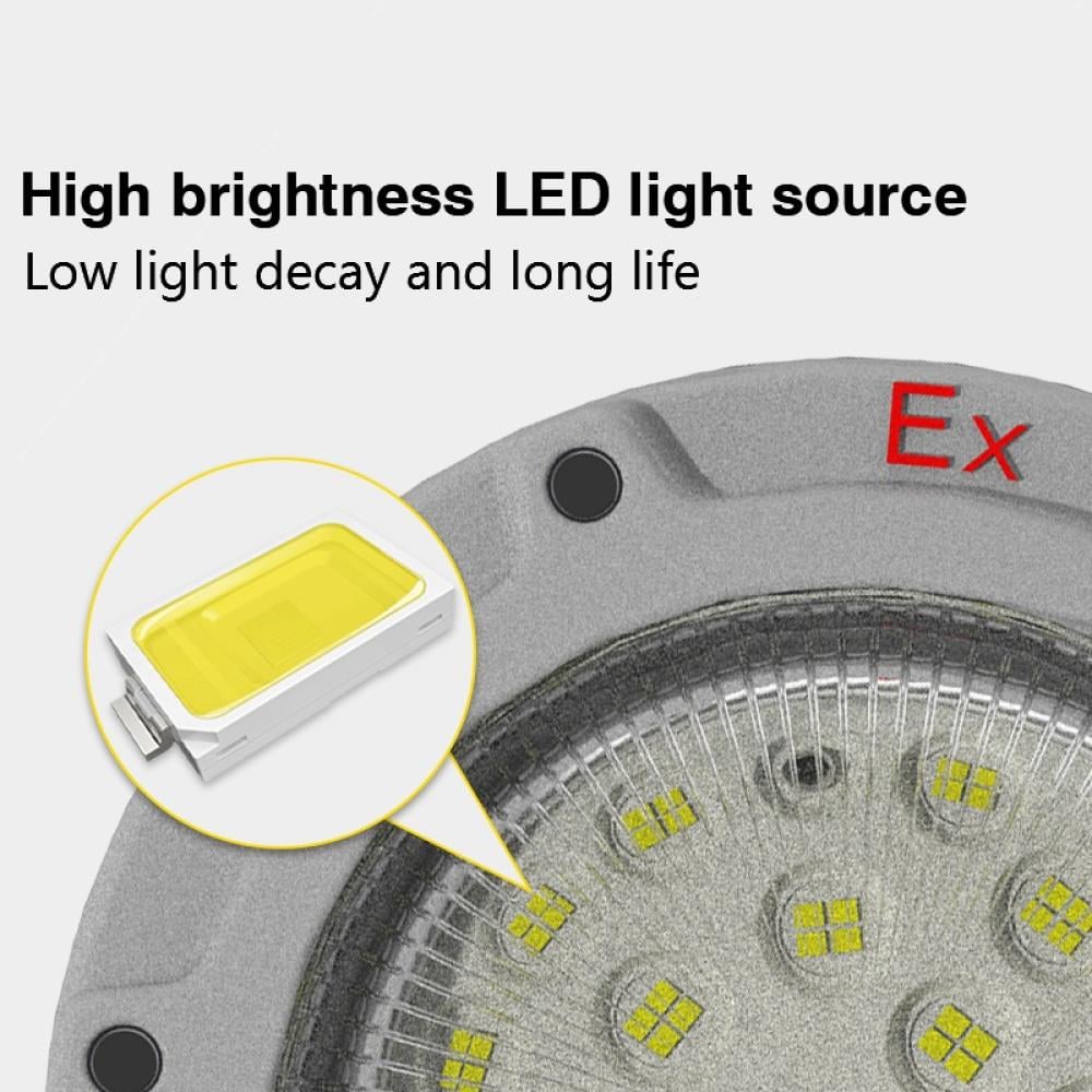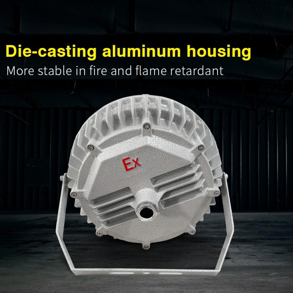 Built from a die-cast aluminum body with a tempered-glass lampshade, it provides exceptional protection against explosion, dust, and moisture – ideal for oil refineries, petrochemical plants, warehouses, and service tunnels.